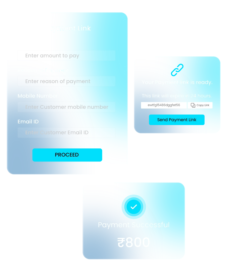 Generate a secure payment link by setting amount, purpose, and customer details instantly.
